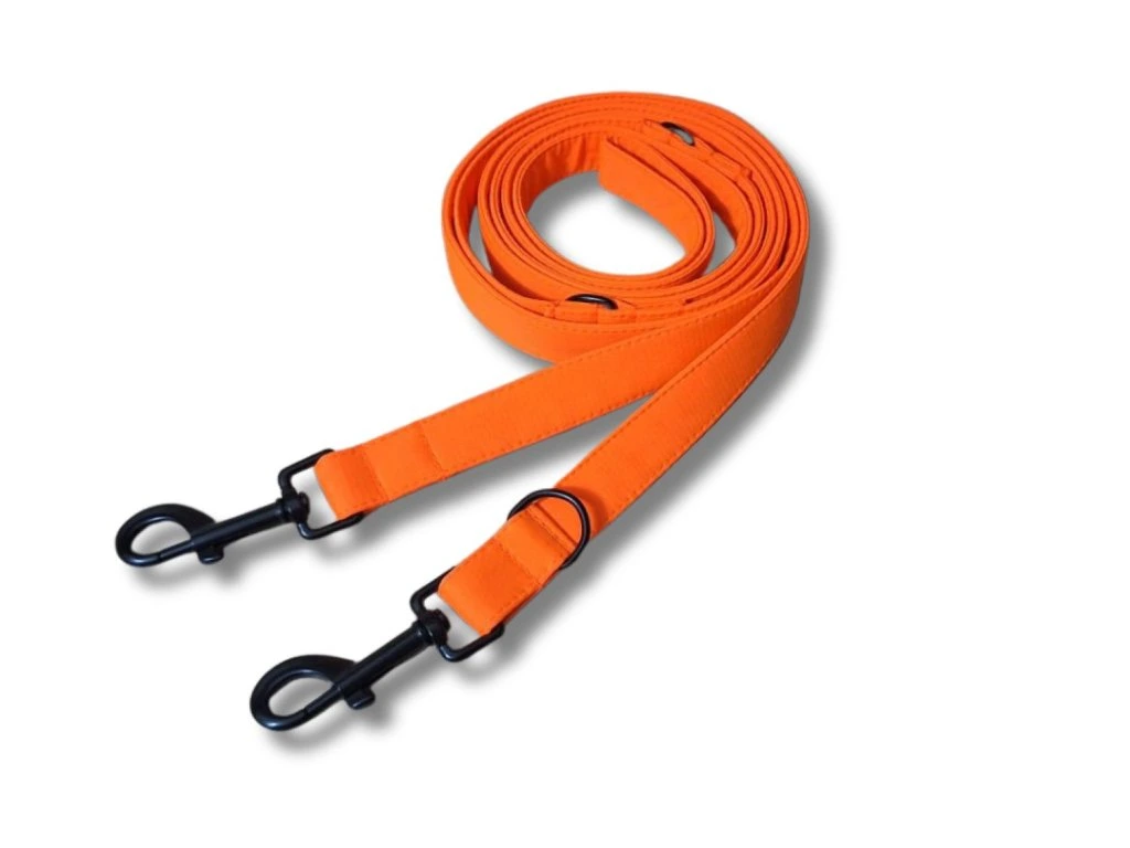 Neonově oranžové přepínací vodítko Active šiji z lehkého softshellu s všitým polypropylenovým popruhem šíře 20 nebo 25 mm. Softshell je příjemný do ruky, neklouže v dlani a ani při delším venčení netlačí. Odolává vlhkosti i nečistotám, takže ho bez obav vezmete do přírody i za špatného počasí.