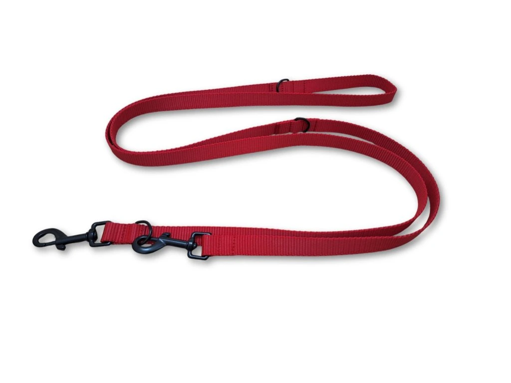 Červené přepínací vodítko Basic šiji z polypropylenového popruhu šíře 20 nebo 25 mm. Popruh je pevný, lehký, odolný vůči vlhkosti a snadno se čistí – zvládne každodenní používání v každém ročním období.