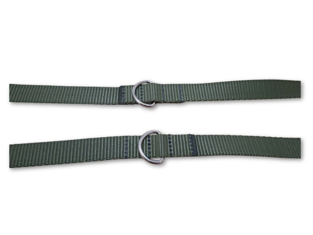 Popruh: 100% polypropylen (šíře 20 nebo 25 mm), karabina: zinkoslitina, hliník, nerezová ocel, půlkroužky: ocel.