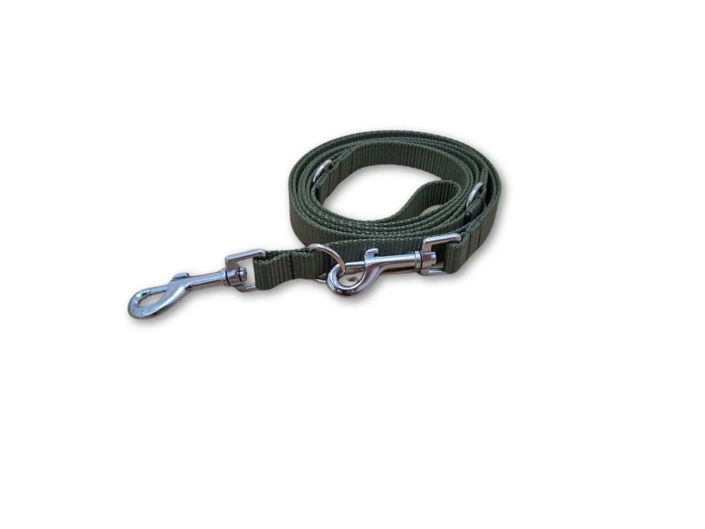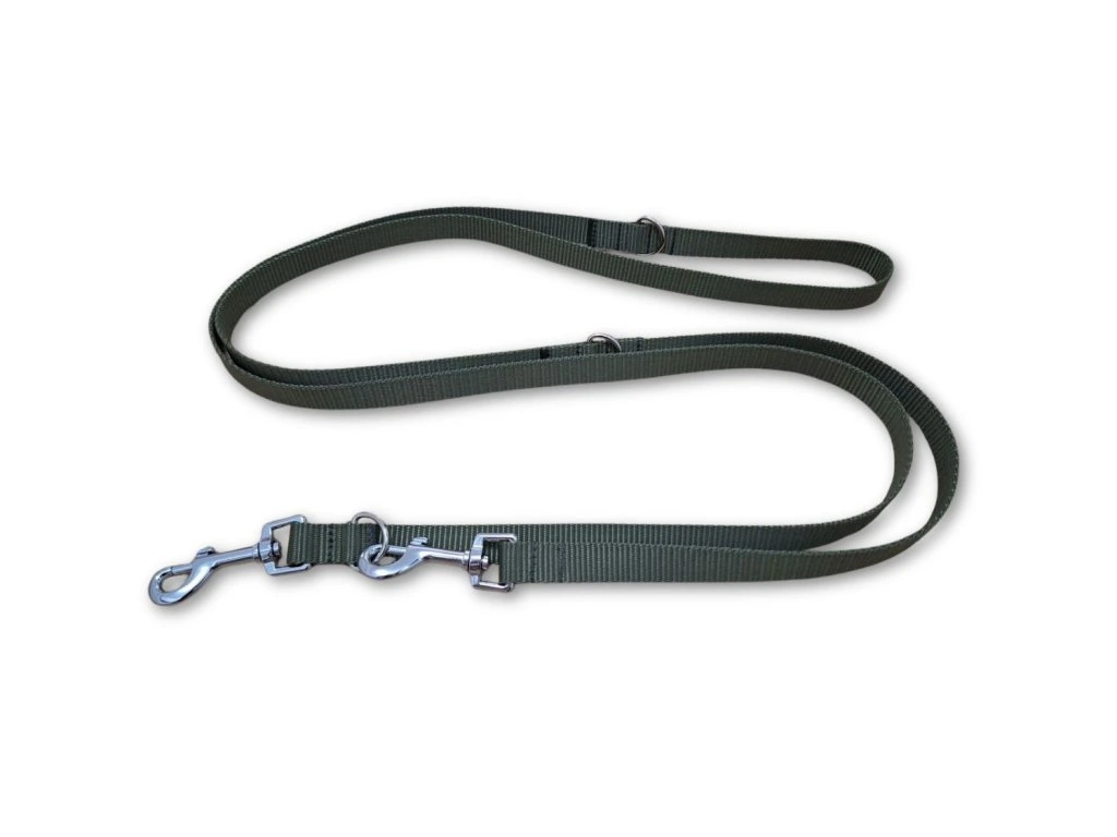 Khaki přepínací vodítko Basic šiji z polypropylenového popruhu šíře 20 nebo 25 mm. Popruh je pevný, lehký, odolný vůči vlhkosti a snadno se čistí – zvládne každodenní používání v každém ročním období.