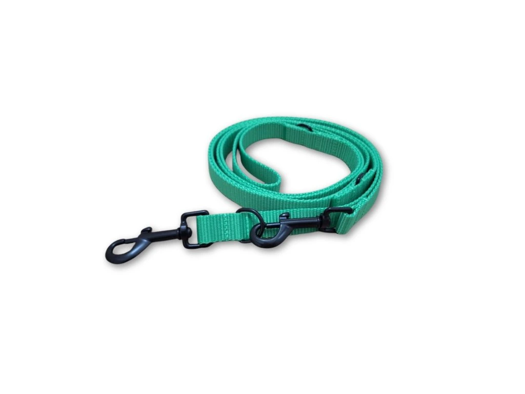 Neonově zelené přepínací vodítko Basic šiji z polypropylenového popruhu šíře 20 nebo 25 mm. Popruh je pevný, lehký, odolný vůči vlhkosti a snadno se čistí – zvládne každodenní používání v každém ročním období.