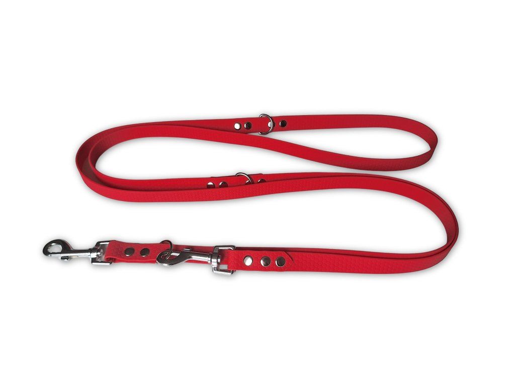 Stylové přepínací vodítko z voděodolného Hexa popruhu v červené barvě je ideální volbou pro každodenní použití ve městě i v přírodě. Nevadí mu voda, bláto ani déšť – neabsorbuje vlhkost, nezapáchá, je antibakteriální a velmi snadno se udržuje. Na výběr z pěti délek.
