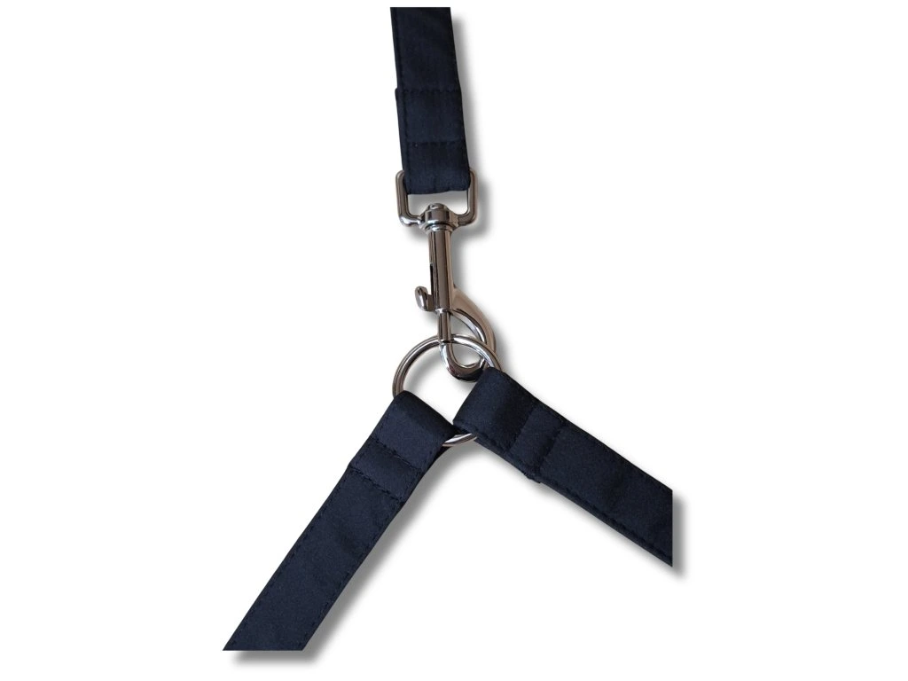 K rozdvojce volíte karabiny podle velikosti psů. Šíře popruhu 2 cm s karabinou pro malá nebo střední plemena, šíře 2,5 cm s karabinou pro velká plemena. Karabiny jsou dostupné také v černé barvě – stačí to uvést v poznámce k objednávce. Přehled všech dostupných karabin najdete v článku o karabinách. Případně mi zavolejte nebo napište – ráda poradím.