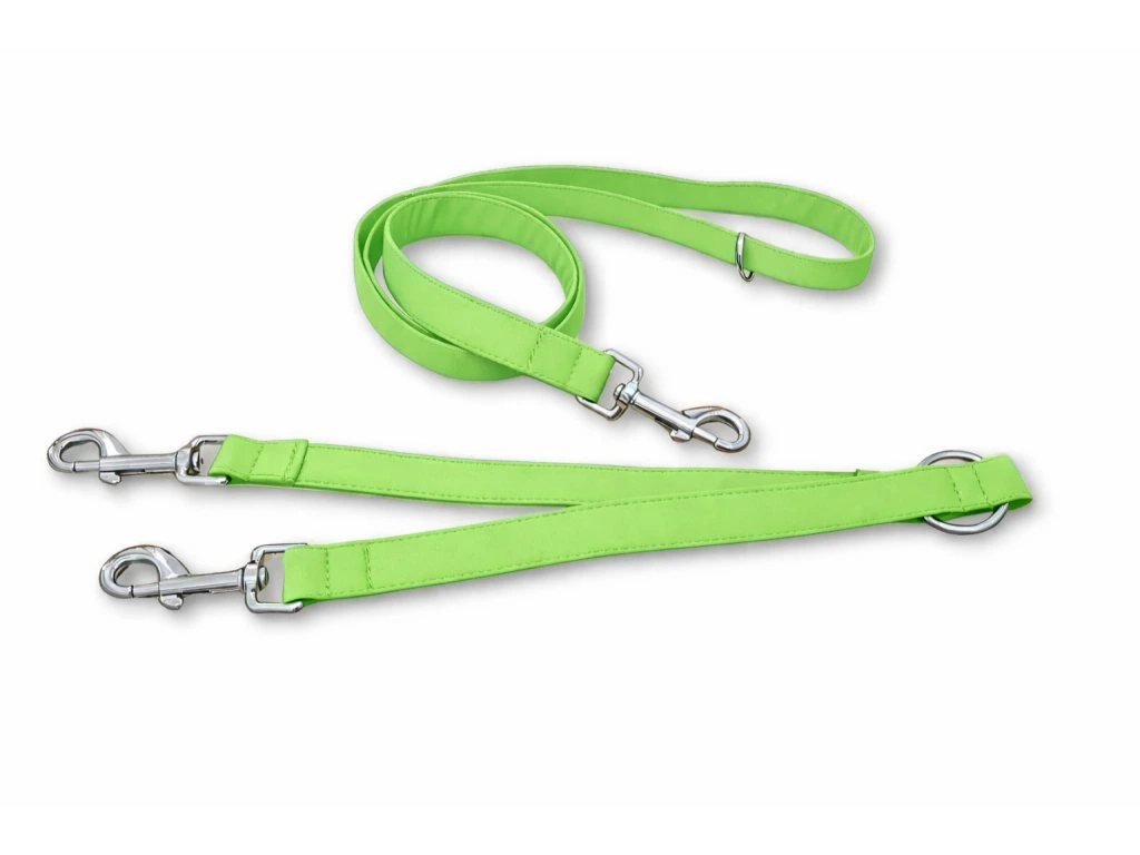 Světle zelený set Active Duo šiji z lehkého softshellu s všitým polypropylenovým popruhem šíře 2 nebo 2,5 cm. Softshell je příjemný do ruky, nedře do dlaně ani při větším tahu a odolává vlhkosti i nečistotám. Set tvoří vodítko délky 1,5 m a rozdvojka délky 60 cm s kroužkem, ke kterému vodítko jednoduše připnete.