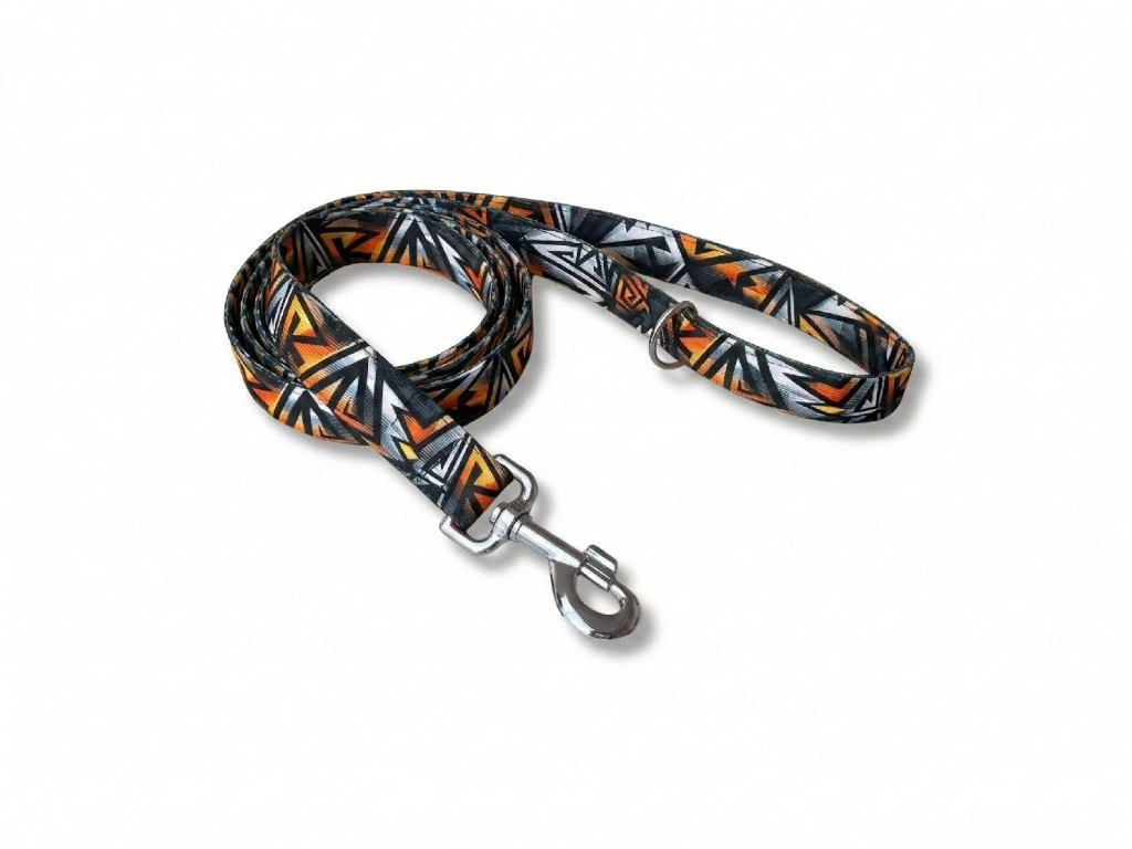 Softshellové vodítko Active, ve vzoru Dynamické trojúhelníky, šiji z lehkého softshellu s všitým polypropylenovým popruhem šíře 2 nebo 2,5 cm. Softshell je příjemný do ruky, nedře do dlaně ani při větším tahu a odolává vlhkosti i nečistotám. Vodítko si zachovává tvar i při každodenním používání.