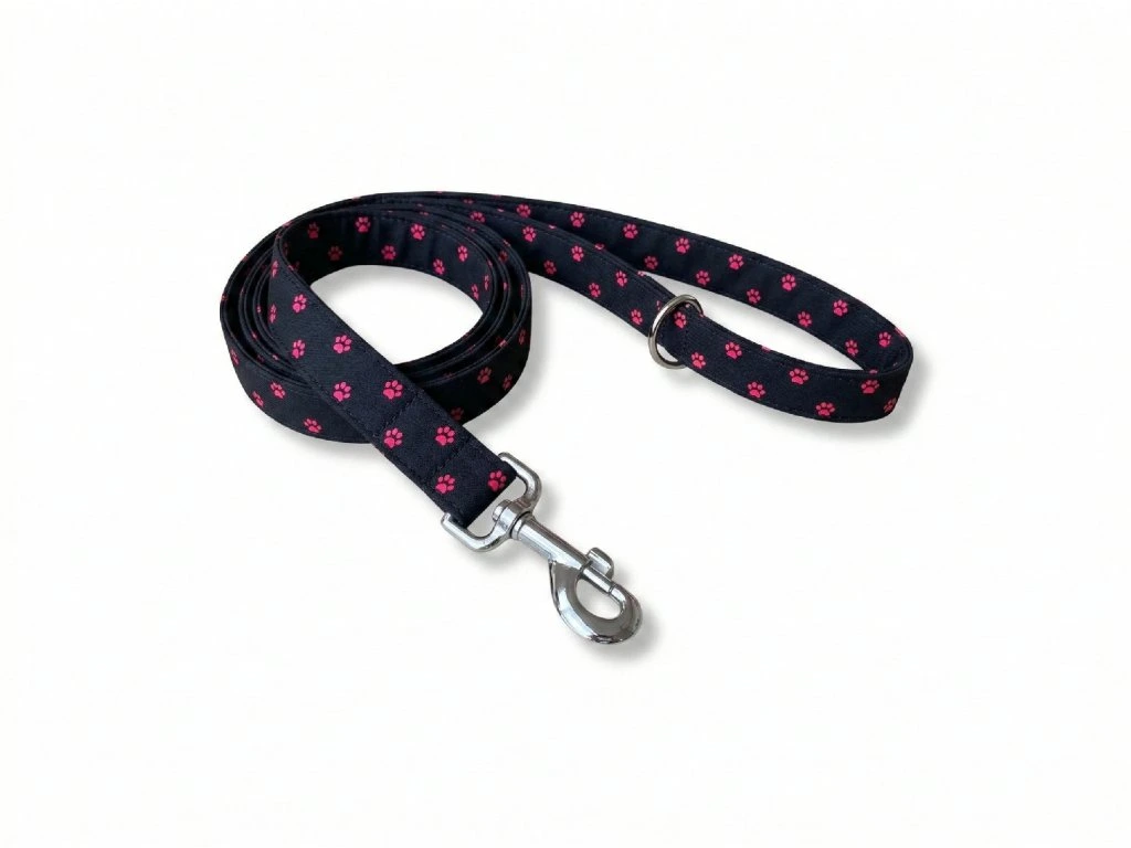 Softshellové vodítko Active, ve vzoru Růžové tlapky, šiji z lehkého softshellu s všitým polypropylenovým popruhem šíře 2 nebo 2,5 cm. Softshell je příjemný do ruky, nedře do dlaně ani při větším tahu a odolává vlhkosti i nečistotám. Vodítko si zachovává tvar i při každodenním používání.