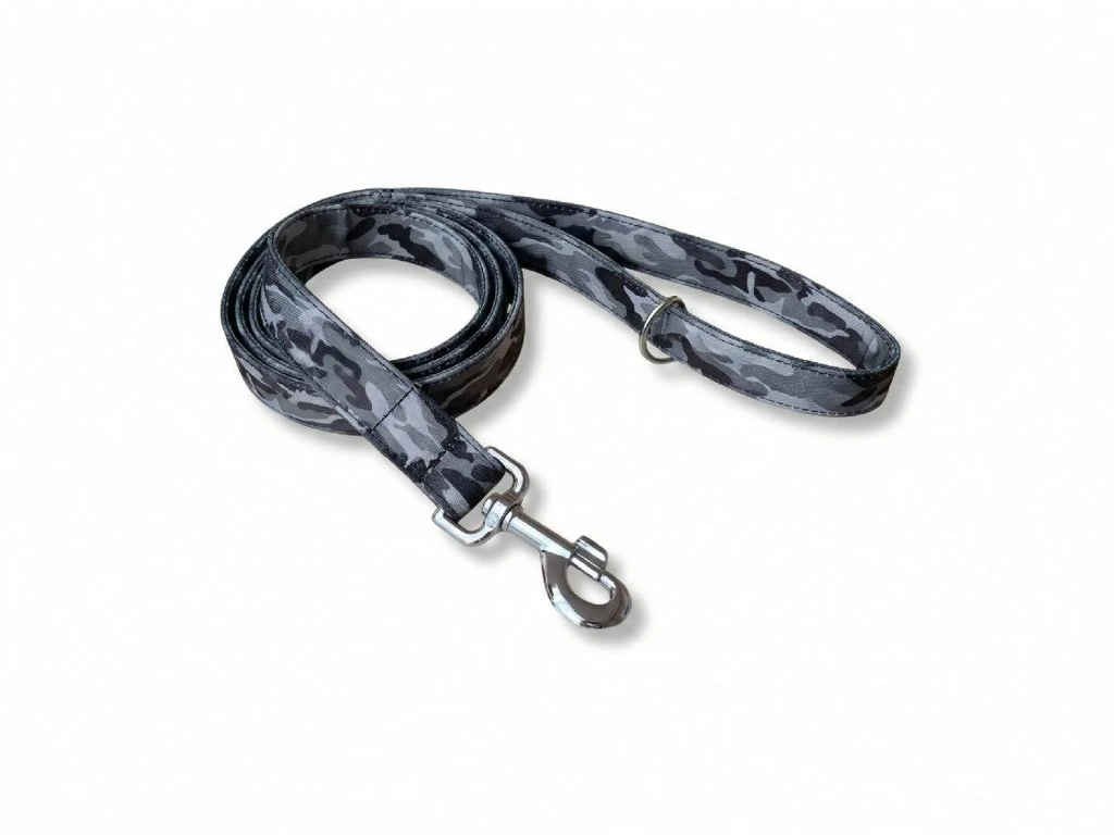 Softshellové vodítko Active, ve vzoru Šedý maskáč, šiji z lehkého softshellu s všitým polypropylenovým popruhem šíře 2 nebo 2,5 cm. Softshell je příjemný do ruky, nedře do dlaně ani při větším tahu a odolává vlhkosti i nečistotám. Vodítko si zachovává tvar i při každodenním používání.