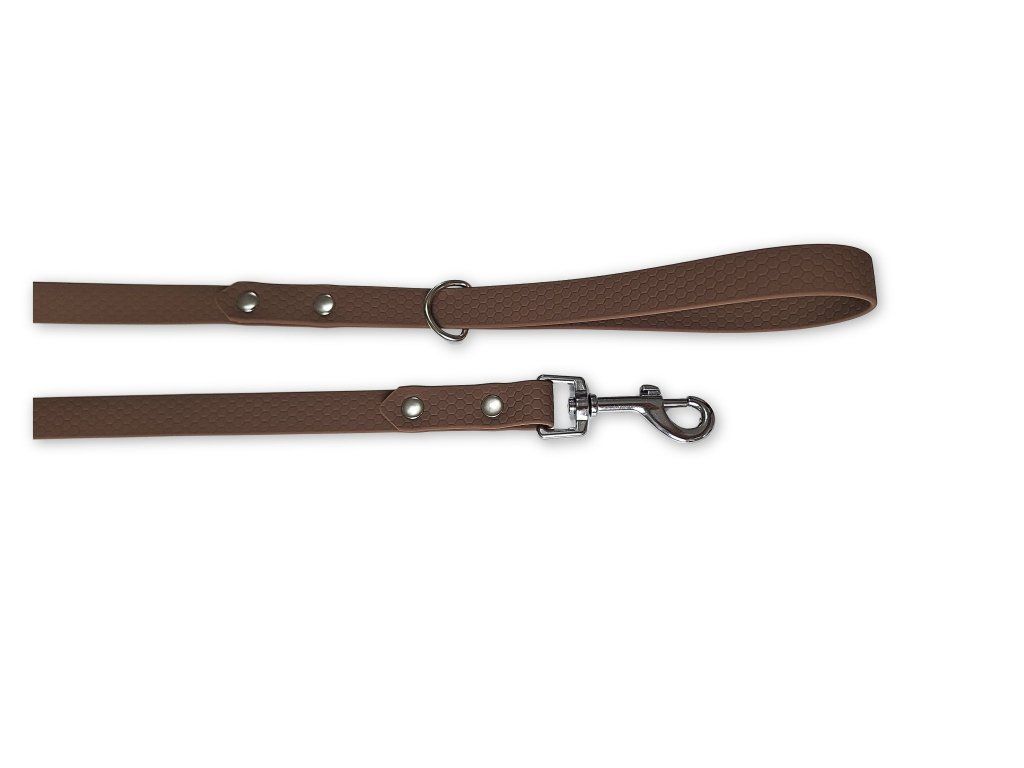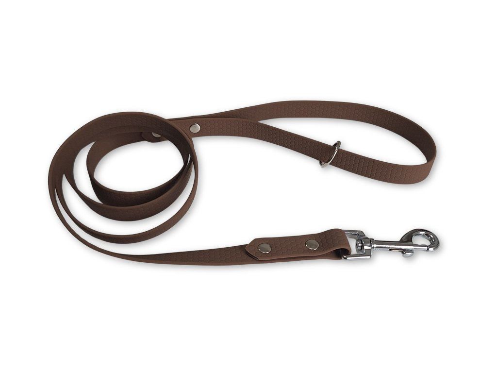 Odolné a stylové vodítko z voděodolného Hexa popruhu v tmavě hnědé barvě je ideální volbou pro každodenní použití i náročnější podmínky. Nevadí mu voda, bláto ani déšť – neabsorbuje vlhkost, nezapáchá a velmi snadno se udržuje.